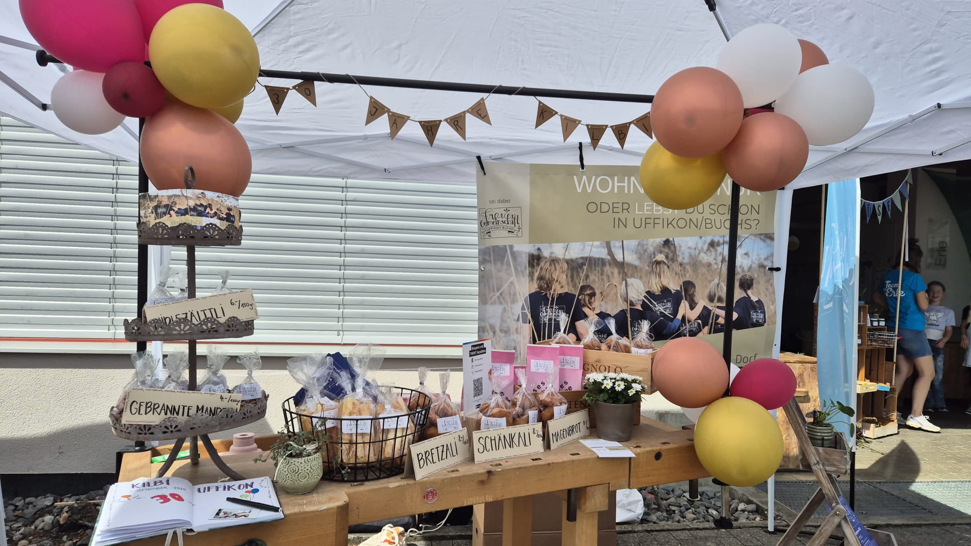 So entstand beim letzten Grossanlass, welcher über alle drei Dorfteile hinweg organisierte war, die Idee, ein Werbebanner zu kreieren. Dieses macht auf die Frauengemeinschaft und ihr Angebot aufmerksam. Seither hängen wir das Banner bei Anlässen im Dorf auf.