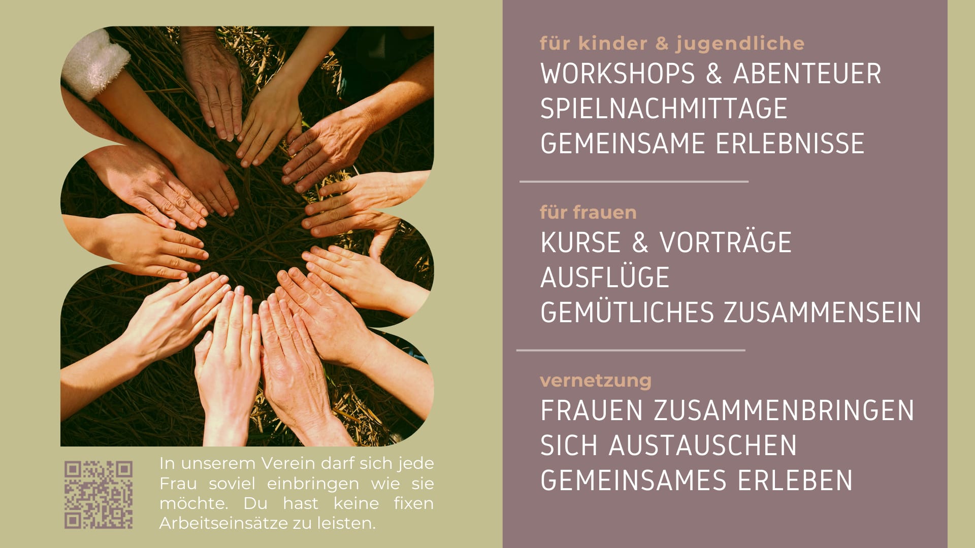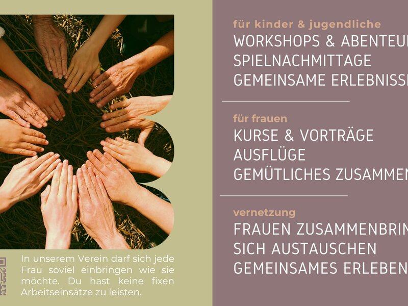 Die Frauengemeinschaft engagiert sich für ein gutes soziales Zusammenleben in den Gemeinden. Das vielfältige Angebot will alle Altersgruppen ansprechen. Dazu gehören Vorträge, Kurse, Basteln mit Kindern, Austausch unter Frauen und Familien, Ausflüge, Kafi-Treffs, religiöse Anlässe.